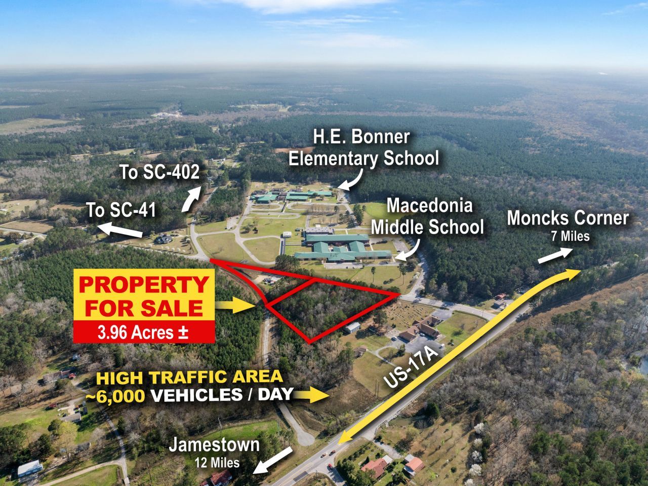 Located in the heart of a growing rural community in Bonneau, this 1-acre commercial parcel offers a rare opportunity for neighborhood-serving development with excellent visibility and consistent daily traffic. Positioned directly along Bethera Rd, the property sits across from both Macedonia Middle School and H. B. Bonner Elementary School, creating strong daily exposure from morning drop-off and afternoon pickup traffic. Together, the two schools serve approximately 1,200+ students, generating steady local activity and visibility for businesses serving the surrounding community. Traffic counts in the immediate area are estimated at up to ~6,000 vehicles per day, providing strong exposure for signage and customer access. (That's ~9,000 daily impressions)The property is well suited for uses consistent with Berkeley County's Rural Neighborhood Commercial vision, including Coffee shop or quick-service restaurant, Convenience retail or neighborhood market, professional office, Hair or nail salon, just to name a few.With its strategic location along a community connector road, proximity to two schools, and easy regional access, this 1-acre parcel presents an excellent opportunity for investors, developers, or owner-operators seeking a visible neighborhood commercial site in Berkeley County.The neighboring 2.96-acre tract is also available, allowing buyers to assemble up to 3.96 total acres for expanded commercial development, additional parking, or multi-building projects.